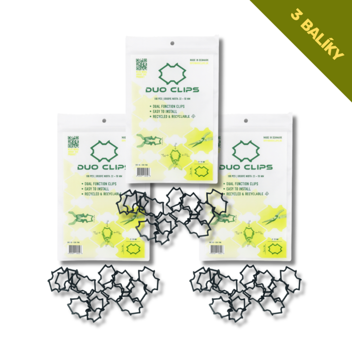 DUO CLIPS pasuje do každej drážky od 22 do 50 mm – horizontálnej aj vertikálnej. Vyrobená z recyklovaného plastu pre minimálnu CO₂ stopu.