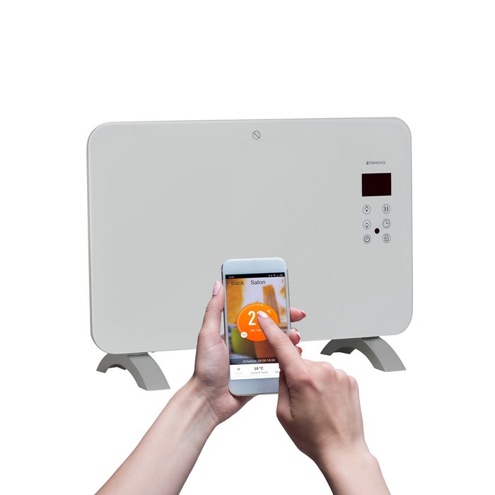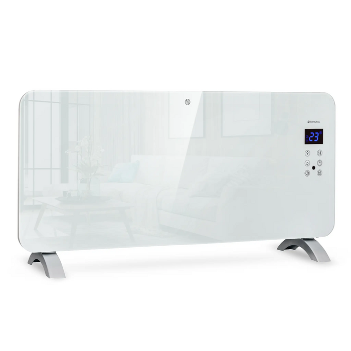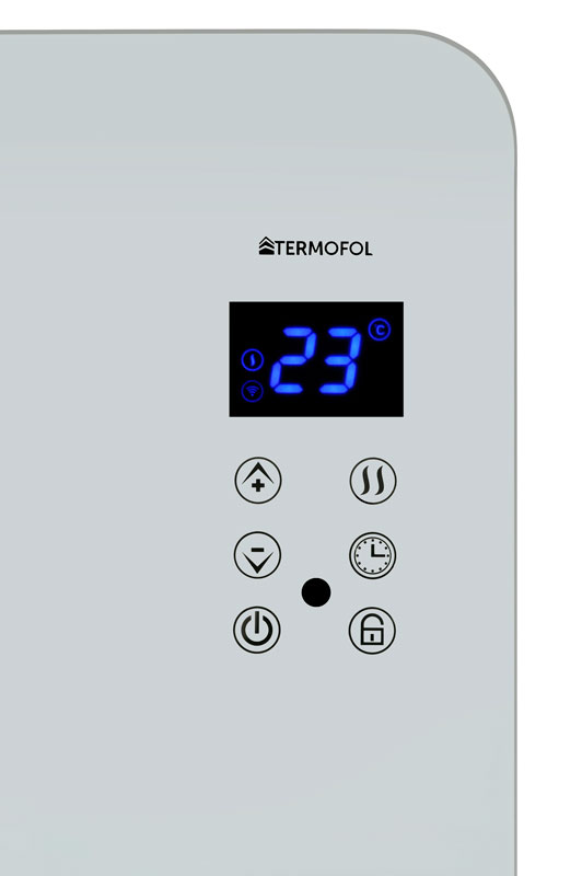 Predná časť je vyrobená z kvalitného tvrdeného skla. Ohrievač je vybavený dotykovým digitálnym termostatom s LCD displejom, ktorý umožňuje presné nastavenie teploty.