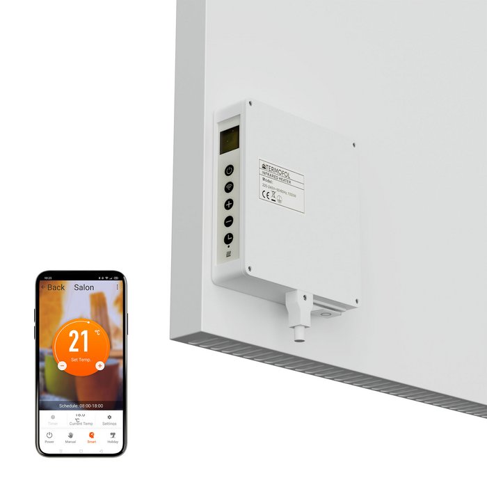 Panely série TF-HMP sú vybavené integrovaným termoregulačným ovládačom s WiFi, takže nie je potrebný žiadny ďalší externý termostat. Po prepojení panela s aplikáciou smartfón preberá kontrolu a komunikuje s termoregulačným systémom.