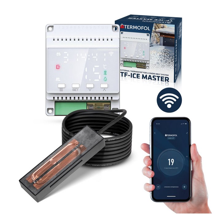 TF-ICE MASTER je moderný externý termostat určený na ovládanie systémov proti námraze a snehu. Pracuje na základe externých snímačov teploty a vlhkosti (predávané samostatne), ktoré monitorujú aktuálne poveternostné podmienky. Na základe údajov termostat automaticky spúšťa alebo vypína vykurovací systém, čím optimalizuje spotrebu energie a zvyšuje bezpečnosť okolia.