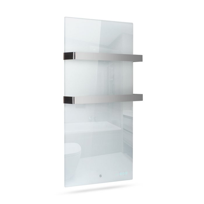 Moderný infračervený kúpeľňový panel TERMOFOL s WiFi, dotykovým ovládaním a elegantnými držiakmi na uteráky pre pohodlie a štýl.