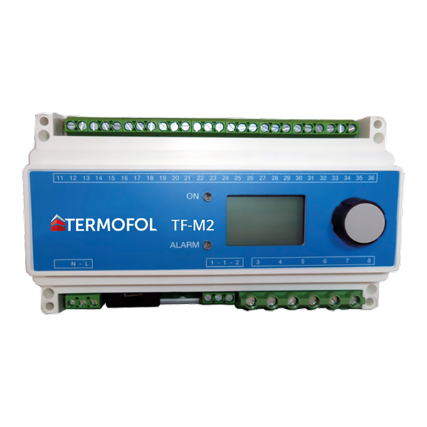 Termoregulátor TF-M2 je určený na riadenie elektrických vykurovacích systémov proti námraze a snehu. Používa sa na ochranu odkvapov a zvodov, proti obladeniu príjazdových ciest, na zabránenie hromadeniu snehu na strechách či na ochranu vonkajších schodov. Umožňuje kontrolu dvoch zón. Všetky parametre nastavené v programe sú viditeľné na LCD displeji. Ovládanie je manuálne pomocou otočného gombíka. Montáž sa vykonáva na DIN lištu.