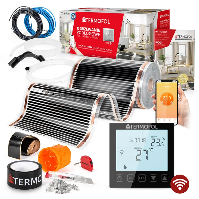 Súprava vykurovacej fólie o šírke 100/50 cm a výkone 60 W/m² s príslušenstvom a termoregulačným zariadením TF-WIFI BLACK